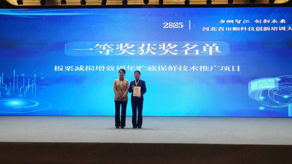 赵玉华老师致力于板栗贮藏保鲜技术开发十几年,项目技术广泛应用于宽城、青龙等燕山板栗主产区,使板栗贮藏损耗率由8-20%降至5%以下,保鲜时间延长了5-6个月,增加了就业岗位,板栗企业女工人数占总职工数的80%。并在承德神栗食品股份有限公司打造了板栗贮藏保鲜技术示范样板,形成了可复制的技术推广模式。