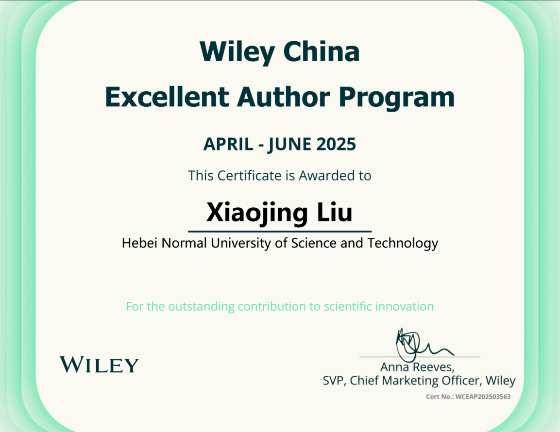 近日,我院刘晓静老师因其发表于国际权威期刊的论文,被国际知名出版机构约翰威立国际出版集团(John Wiley & Sons, Inc., 简称Wiley)授予 “2025年Wiley威立中国高贡献作者奖”,成为第二季度食品科学领域获此殊荣的杰出学者之一。该奖项旨在表彰中国学者在推动全球科研进步中的关键贡献,凸显出学院在食品科学与技术领域的学术影响力。