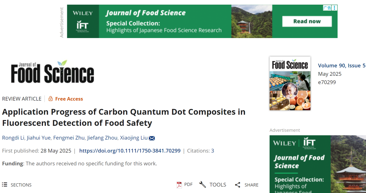 刘晓静老师作为通讯作者的获奖论文“Application Progress of Carbon Quantum Dot Composites in Fluorescent Detection of Food Safety”发表于Wiley旗下期刊《Journal of Food Science》。论文系统论述了碳量子点(CQDs)作为新兴的荧光纳米材料,具有光稳定性好、水溶性强、制备成本低等优势,通过与金属纳米颗粒、MOFs材料、分子印迹聚合物及生物分子等材料复合,可显著增强荧光性能和识别能力。论文中详细分析了异质原子掺杂、表面修饰及结构调控在提升CQDs的发光效率和选择性识别中的关键作用,总结了CQDs复合材料在农药、兽药、重金属及微生物污染检测中的最新研究进展。该工作不仅为推动CQDs纳米荧光材料在食品安全领域的深入应用奠定了基础,也为构建高灵敏度、可现场化的快速检测体系提供了重要参考。刘晓静老师团队的科研成果得益于学院系统性科研支持体系,学院聚焦智慧食品技术、食品质量与安全创新技术等前沿方向,联合多家企业中试基地,加速学院科研成果在食品开发中的应用。