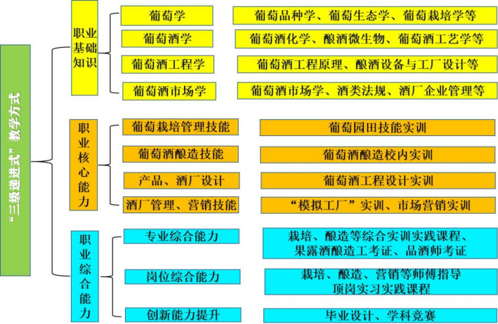 “教练融合”是指采用“三级递进式”教学方式。第一级,重构农、工、文、法等学科融合的专业课程体系;与企业合作开发专业教材和课程资源,促进课程内容与技术发展衔接。第二级,从产业链岗位核心能力要求出发,根据葡萄与葡萄酒生产的季节性适时安排专业实践课程,采用学生顶岗、田间和车间的现场实境教学方式传授理论和技能,推进教学过程与生产过程对接。第三级,由企业专家“师傅”手把手传授,融入职业技能等级考核内容,实现“教、学、做、练、评”一体化。
